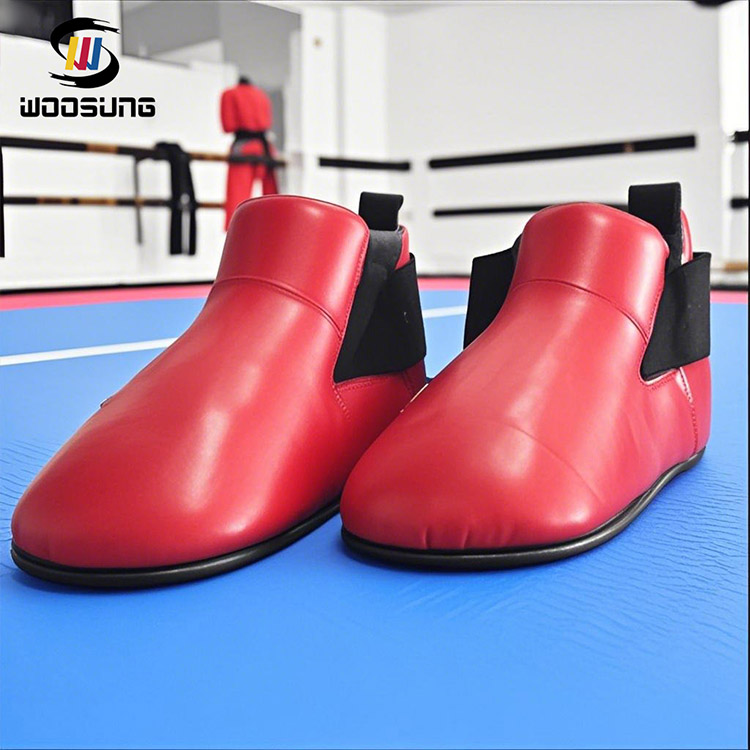 The WOOSUNG® ITF Taekwondo Foot Guard features a bright red leather upper with black decorative lines, creating a striking color contrast and showcasing a unique visual aesthetic.