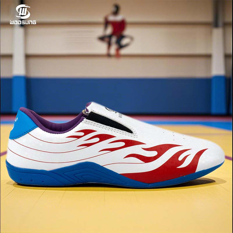 The Taekwondo Sports Shoes by Woosung are designed specifically for the demanding requirements of taekwondo practitioners. Featuring a sleek white upper adorned with vibrant red and blue flame graphics, these shoes not only look impressive but also provide a boost of confidence on the mat. The Woosung brand is synonymous with quality and innovation, and these shoes are no exception.